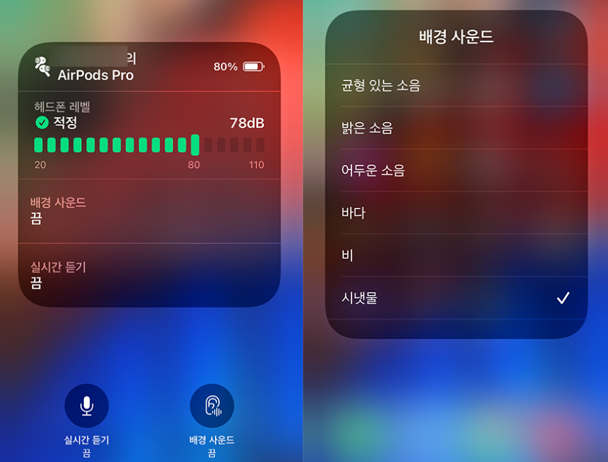 집중력이 필요한 경우 도움이 되는 "배경 사운드 기능" 균등한 소음, 바닷소리, 비, 시냇물 소리 등을 반복적으로 들려주어 외부 시끄러운 잡 소리를 상쇄시켜 집중하는 데 도움을 줍니다. 아래 실시간 듣기 기능을 켜게 되면 저 멀리서 말하는 사람의 소리도 잘 들리는 모드가 되어 상황에 따라 사용하시면 좋을 것으로 생각됩니다.