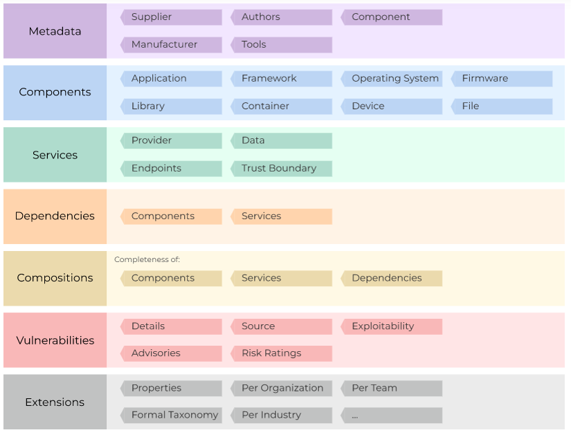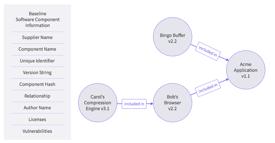 이는 보안 취약점의 식별에 뛰어납니다. 각 컴포넌트의 메타데이터에 포함될 정보는 다음과 같습니다.