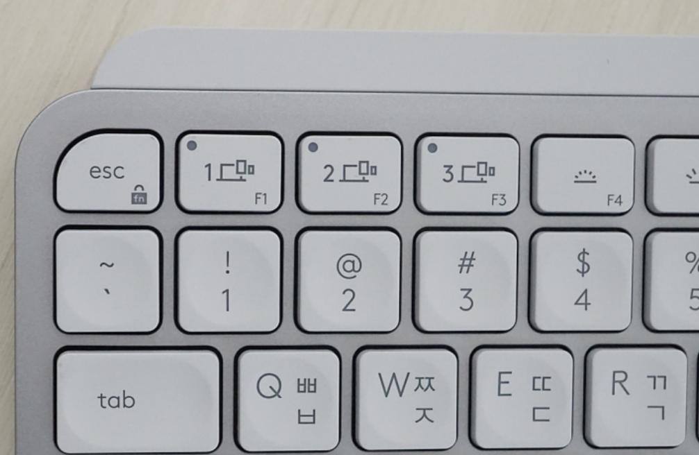 - F1, F2, F3 (멀티 페어링 및 장치 전환): 이들 키는 멀티 디바이스 연결 및 빠른 전환을 가능하게 합니다. F1, F2, F3를 길게 누르면 새로운 디바이스와의 페어링 모드로 진입하며, 짧게 누를 경우 이미 페어링 된 장치 간 전환을 수행합니다.