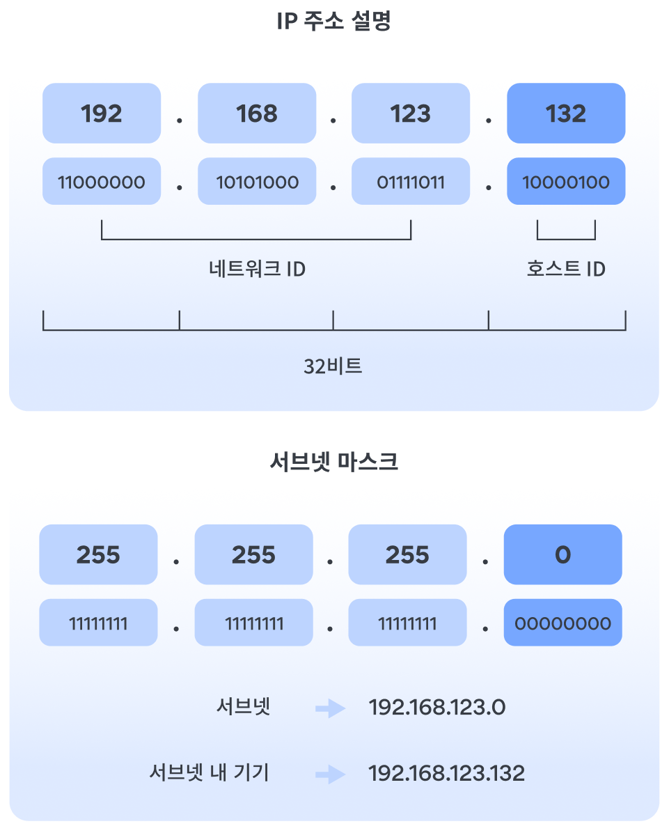 IP 주소 = 네트워크 iD + 호스트 iD로 분리됩니다.