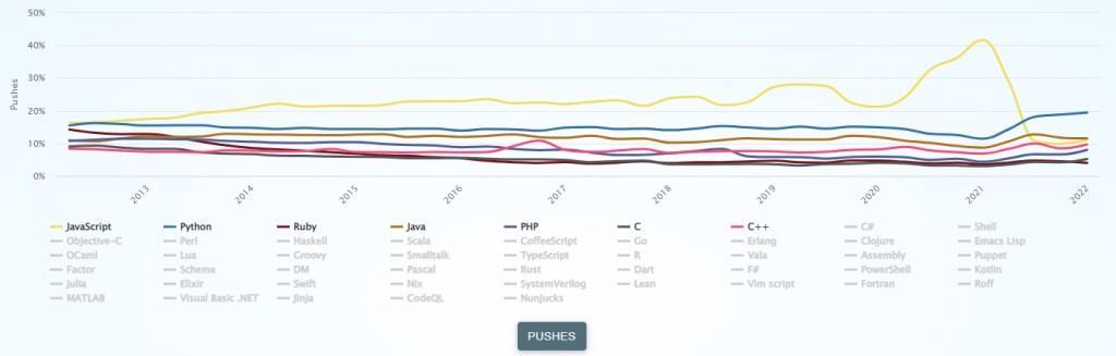 2022년 1분기 Push 기능에서 자주 사용된 개발 언어 순위 1~10위는 아래와 같습니다.