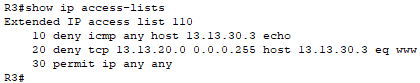 (R3 외부에서 오는 트래픽 중 출발지 네트워크가 ‘13.13.20.0/24’인 트래픽이 내부 로컬 웹서버 ‘13.13.30.3’에 접근하는 것을 차단) access-list 110 deny tcp 13.13.20.0 0.0.0.255 host 13.13.30.3 eq 80